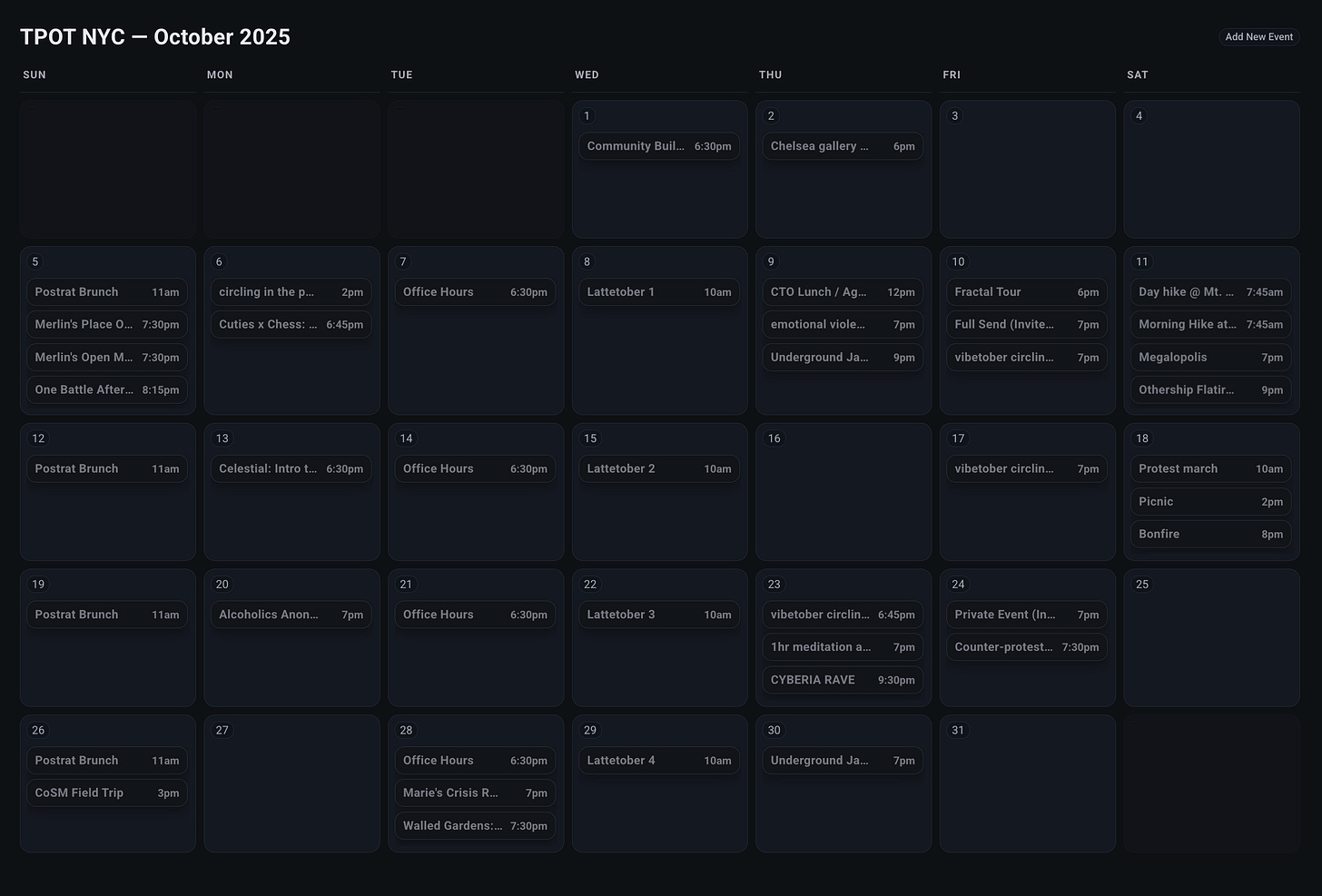 Notable events include AI for Collective Sensemaking Unconference, The Threshold, Feral Pawg’s 40th birthday, Lattetober, Office Hours, Fractal Brunch, and more.